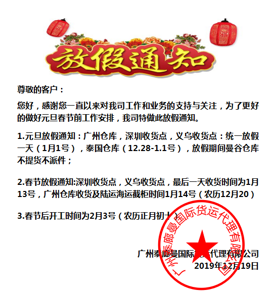 2.春節(jié)放假通知:深圳收貨點(diǎn),義烏收貨點(diǎn),最后一天收貨時間為1月13號,廣州倉庫收貨及陸運(yùn)海運(yùn)截柜時間1月14號(農(nóng)歷12月20)