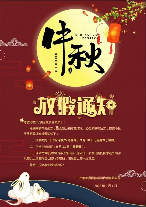 一年一度的中秋佳節,根據國家有關規定,結合我司實際情況,也為了滿足廣大客戶朋友的出貨安排,經公司總經辦商討決定中秋放假通知如下: